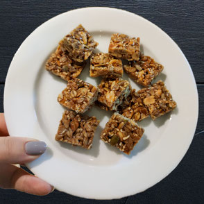 Sonnenblumenkerne, Kürbiskerne, Glykosesirup (Zuckerrübensirup), Butter, Bienenhonig, Spezialzucker (Traubenzucker, Weizenstärke, Palmfett, natürliches Aroma), Sesamsamen, Speisesalz jodiert